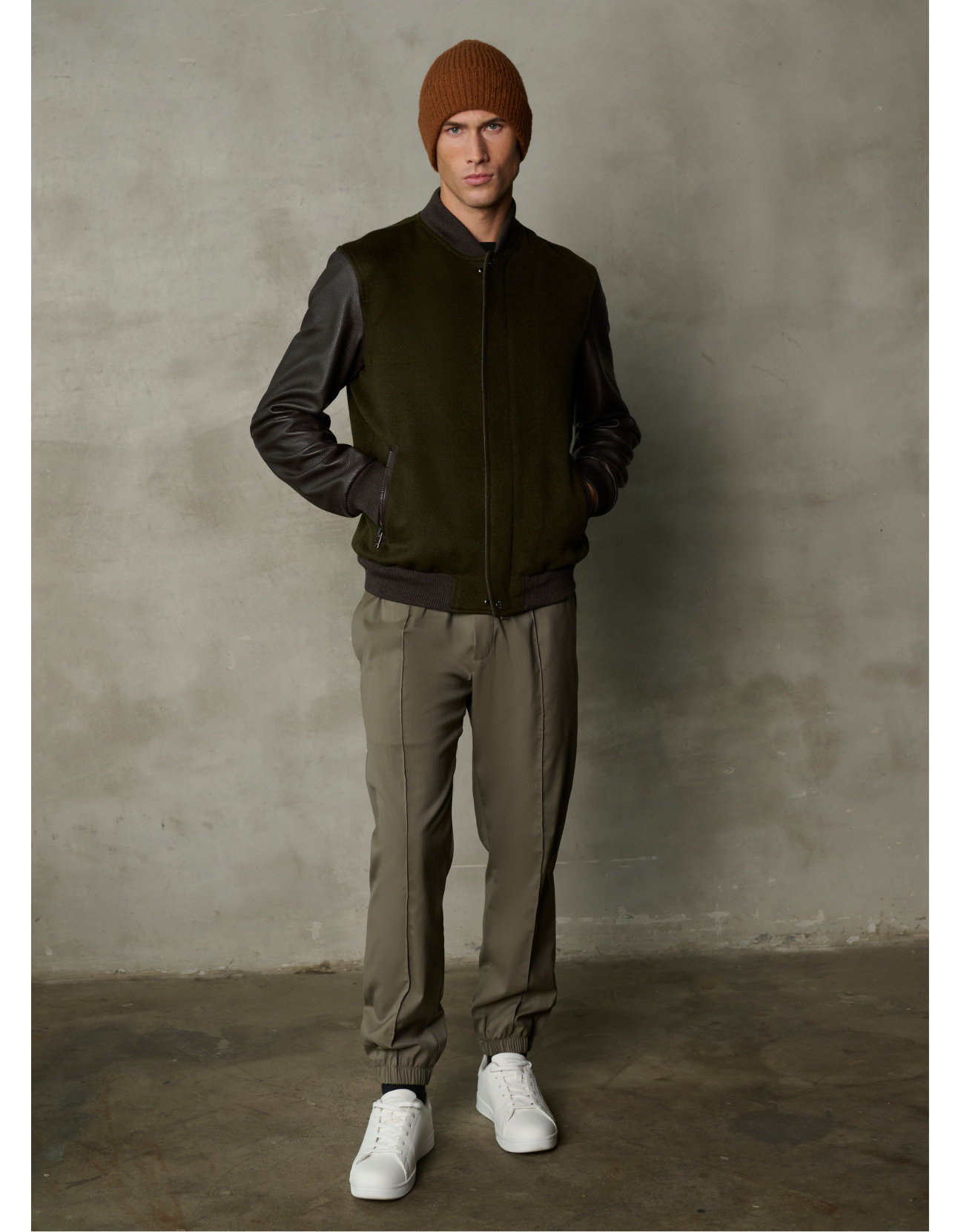 Bimateric Varsity Bomber with Body in Loro Piana "Capolavoro" Rain System Wool and Sleeves in Deer Leather.